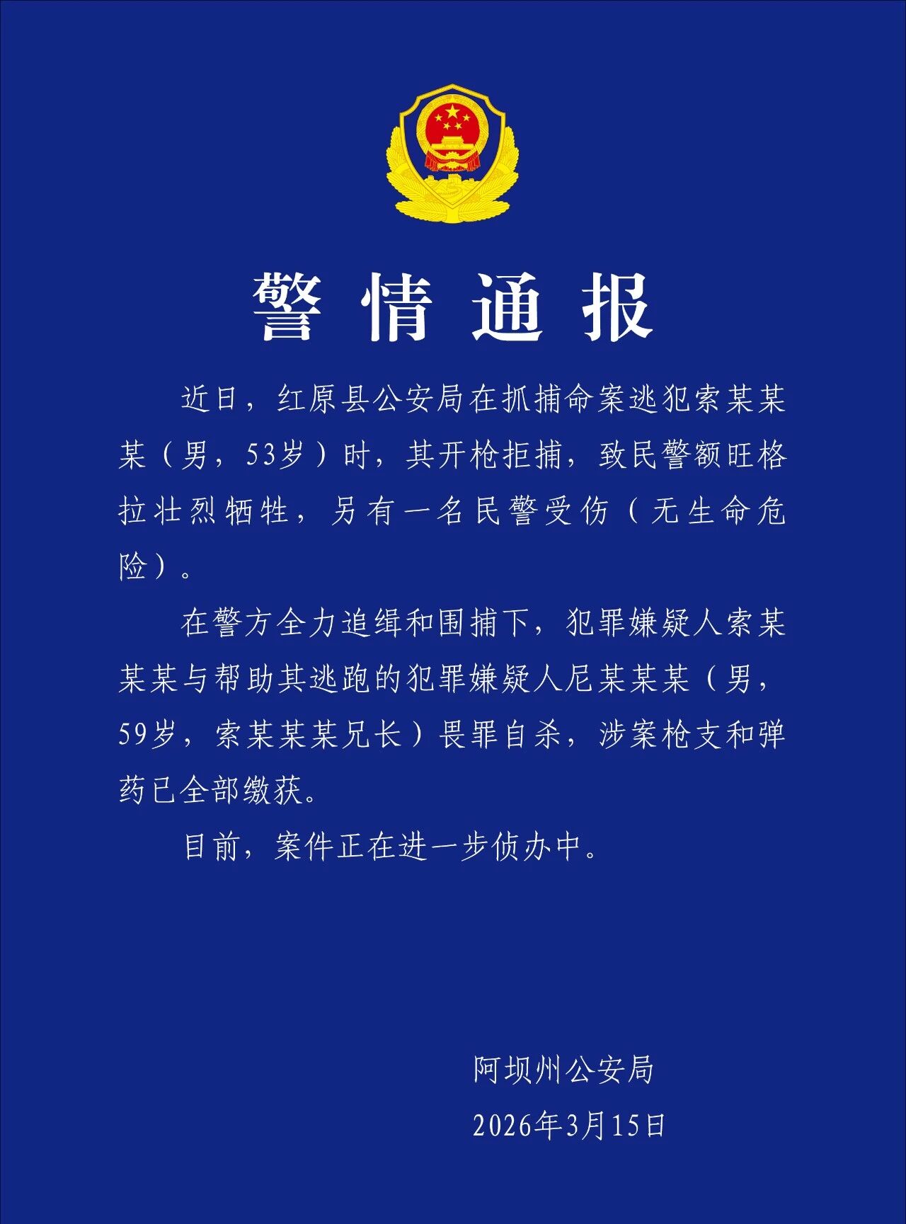 3月15日,四川阿坝州公安局发布一则警情通报称,近日,红原县公安局在抓捕命案逃犯索某某某(男,53岁)时,其开枪拒捕,致民警额旺格拉壮烈牺牲,另有一名民警受伤(无生命危险)。